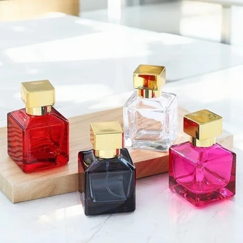 Modern Colorful Unique 50ml Square Pink Red Grey clear Glass Refillable Perfume Spray Bottle with Gold Lid