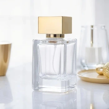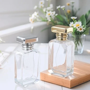 • Luxury Elegant Flat square Clear 50ml Empty Crimp Neck Glass Perfume Spray Bottle with Gold Silver Lid