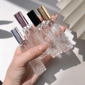 • Travel Portable Small 12ml Embossed Pattern Square Clear Glass Perfume Spray Bottle with Rose Gold Silver Black Cap