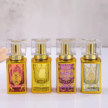 • Vintage Luxury Electroplated Gold 30ml Square Arabic Dubai Style Glass Perfume Spray Bottle with Lid