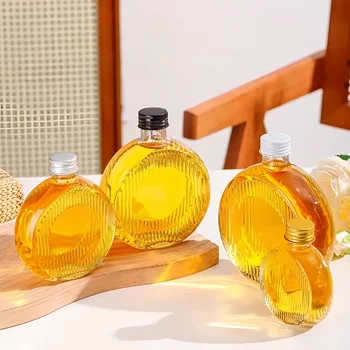 • Custom Label Flat Round 50ml 100ml 200ml 250ml 350ml 500ml Vertical Stripe Glass Juice Wine Milk Beverage Bottle with Lid